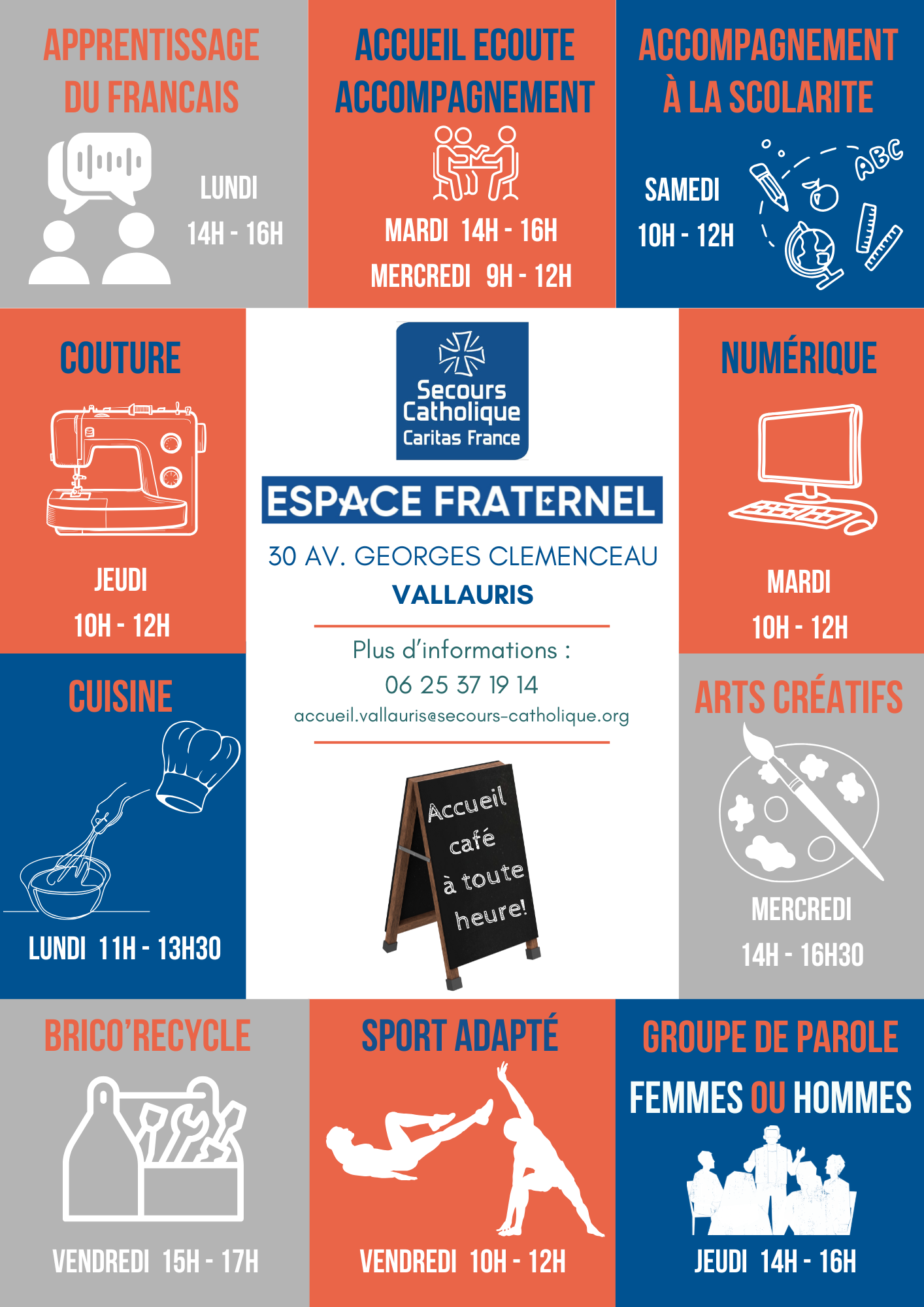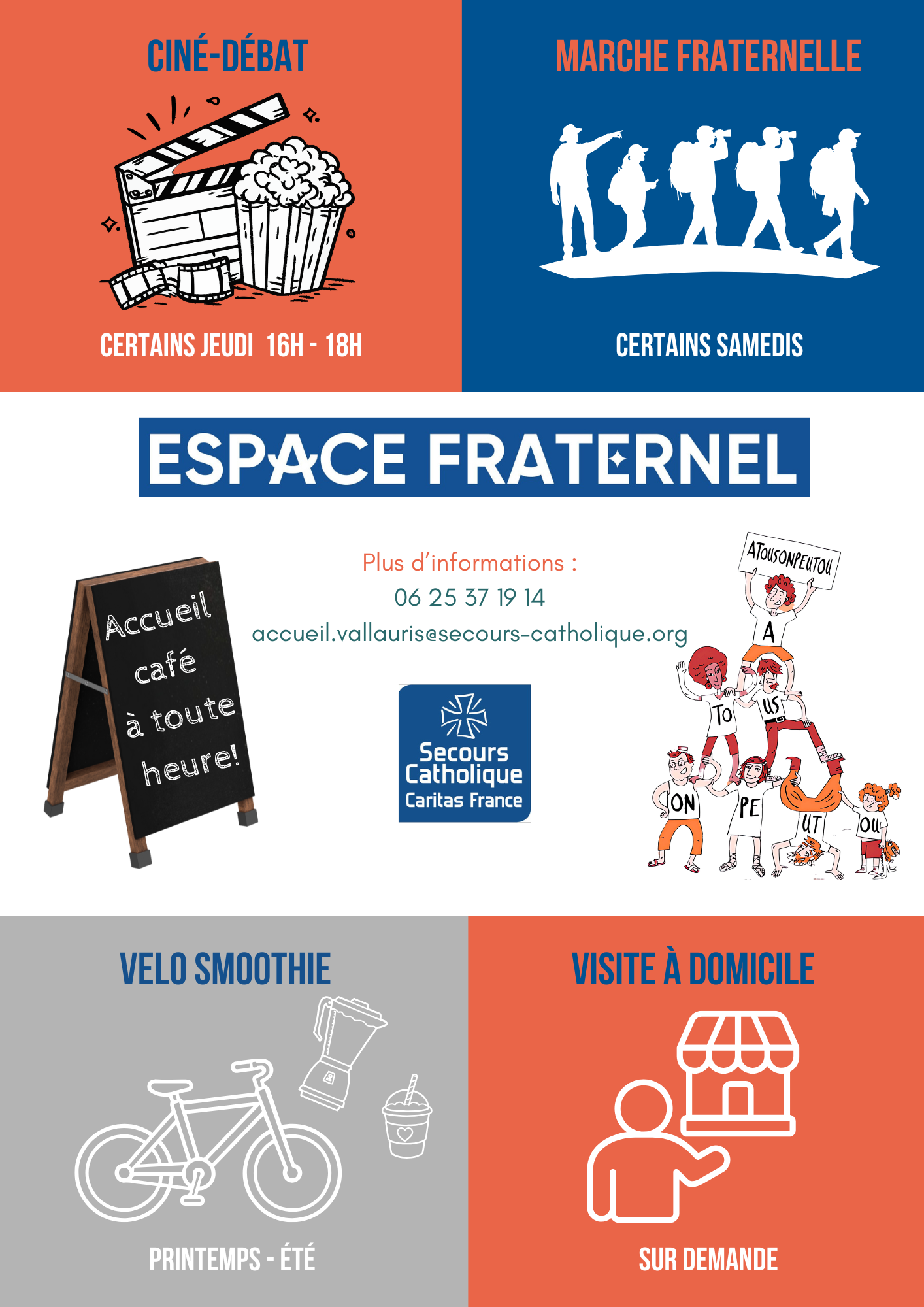 L’Espace Fraternel propose chaque semaine de nombreuses activités gratuites : ateliers créatifs (couture, cuisine, bricolage, arts créatifs, numérique), activités sportives adaptées, groupes de parole, ainsi que des temps d’accueil et d’accompagnement. De nouveaux projets sont déjà en préparation, comme des ciné-débats, des marches fraternelles ou des visites à domicile.
